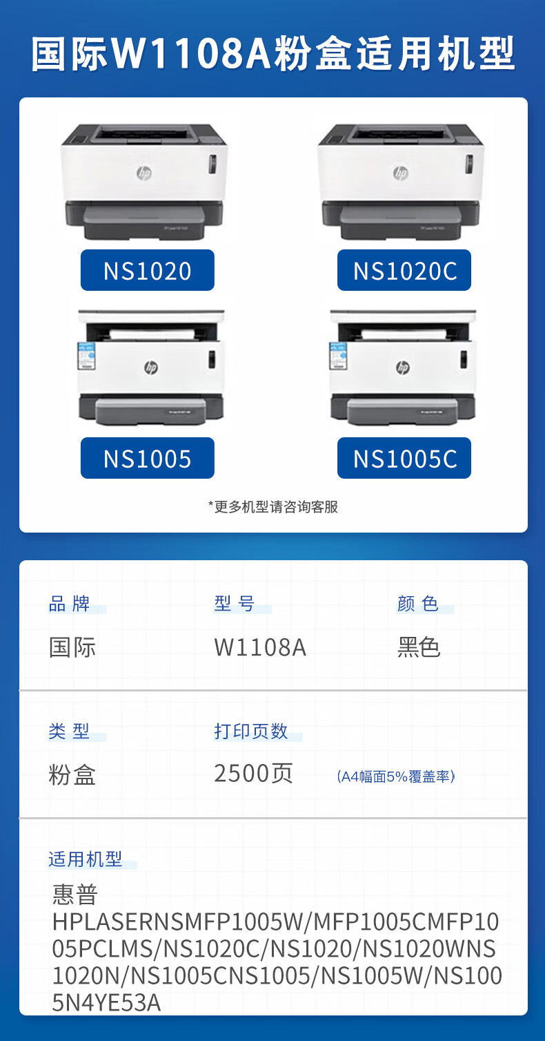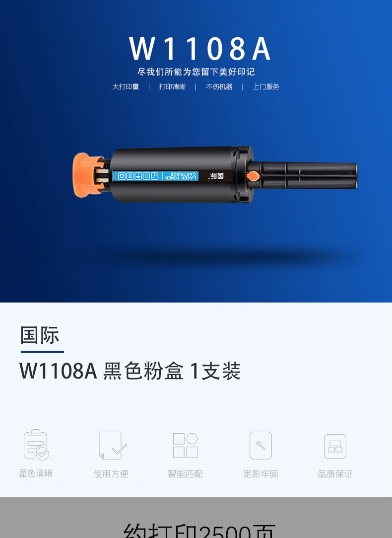 国际 W1108A 粉盒适用惠普W1108A粉盒HP108AD打印机墨盒NS1020c/w硒鼓mfp1005c/w闪充 W1108A/108A碳粉盒1支装-共2500页