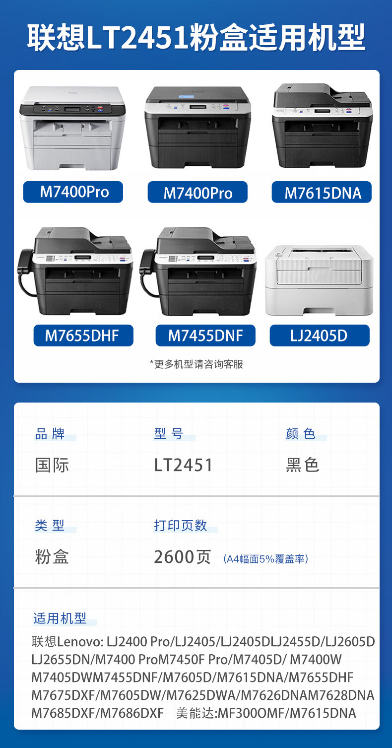 国际 LT2451 粉盒 适用联想LJ2400PRO打印机硒鼓M7400PRO墨盒M7450FPRO粉盒LJ2605D墨粉LT2451黑色 标准版易加粉粉盒2600页