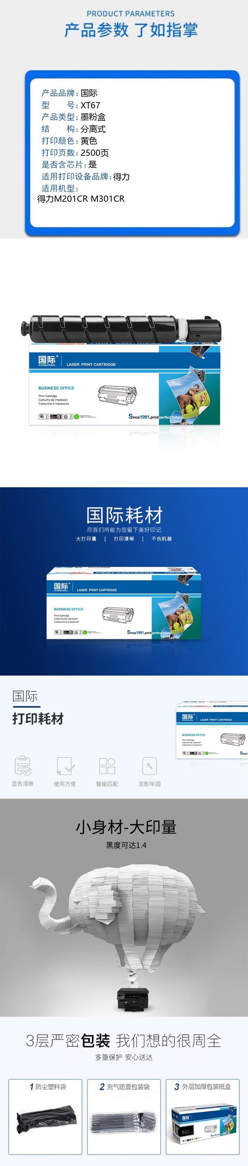 国际 XT-67Y 粉盒 适用得力复印机耗材M201CR硒鼓墨粉盒XT67Ke粉盒XT67碳粉感光鼓M301CR打印机晒鼓 XT-67 标准黄色粉盒