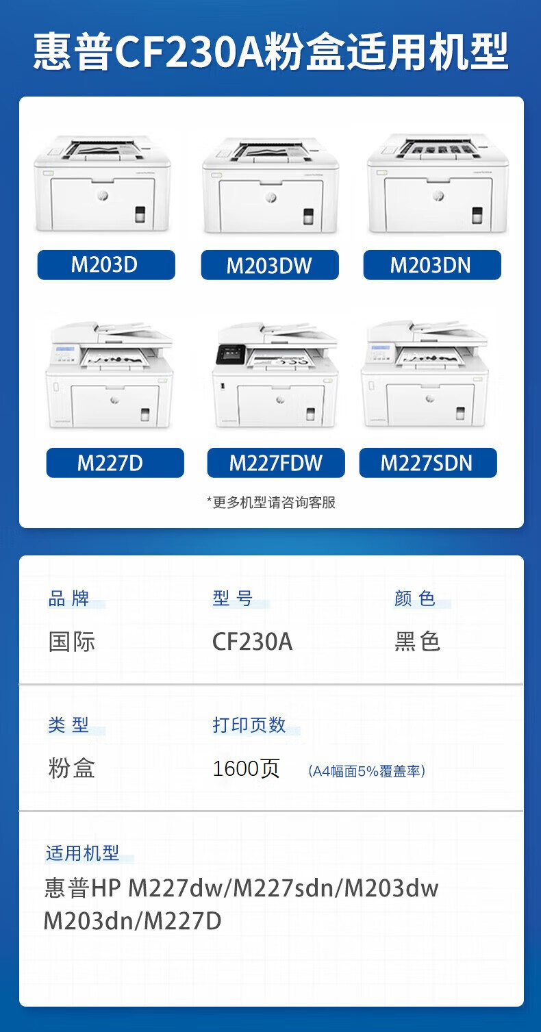 国际 CF230A 硒鼓 适用惠普cf230a硒鼓227fdw墨盒打印机227fdn 203dw粉盒带芯片上机即用标准版1支装约1600页