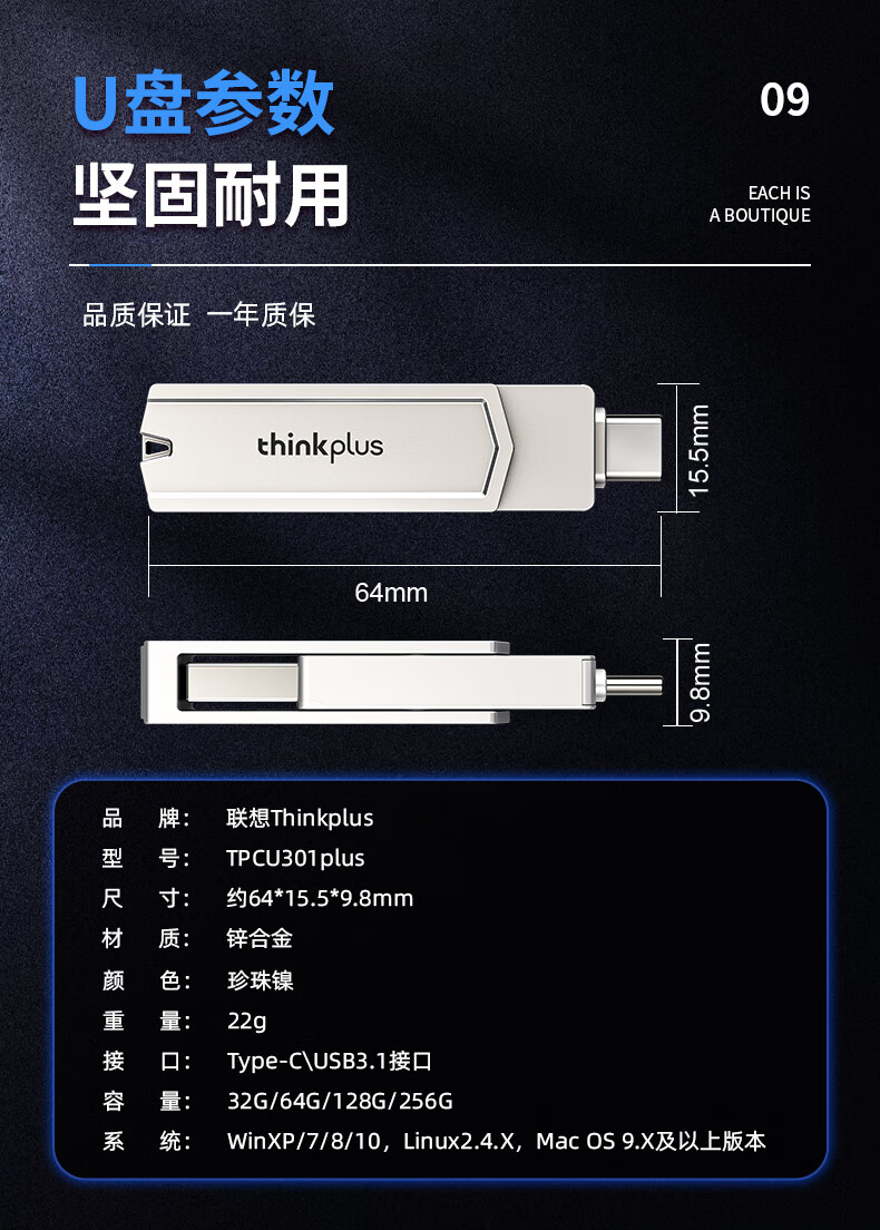 联想/LENOVO TPCU301plus TYPE-C 256G U盘/存储卡 商务办公优盘 USB3.0+Type-C 双口