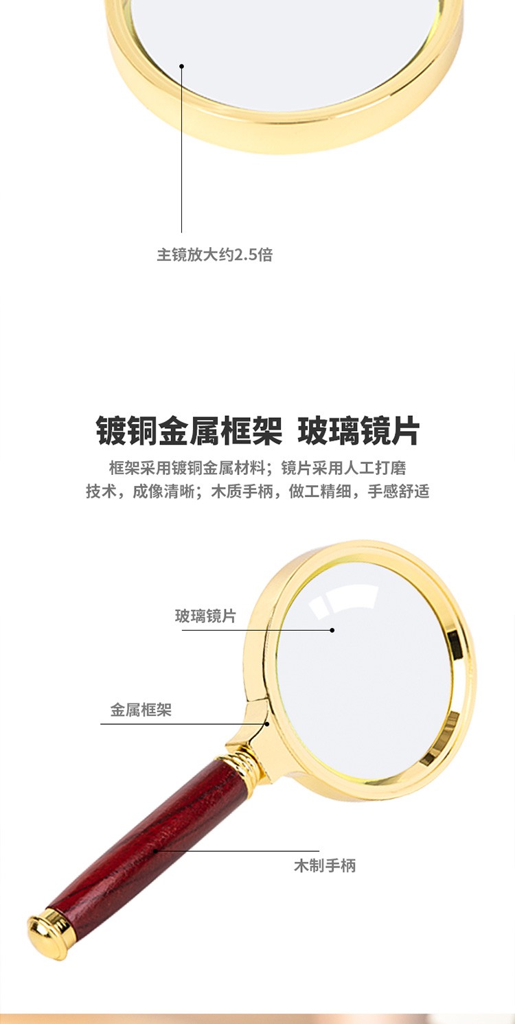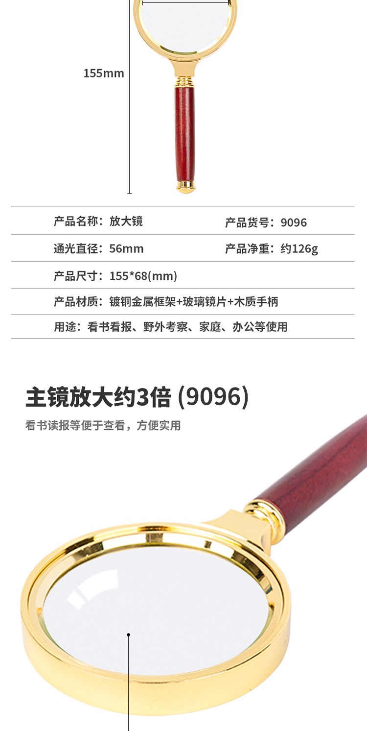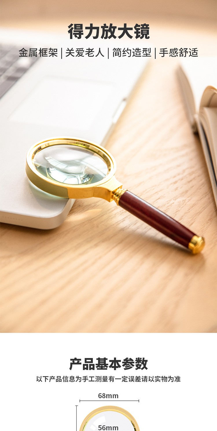 得力/deli 9096 放大镜 老人阅读儿童光学放大镜金属放大镜复古金属框红木手柄架 直径60mm