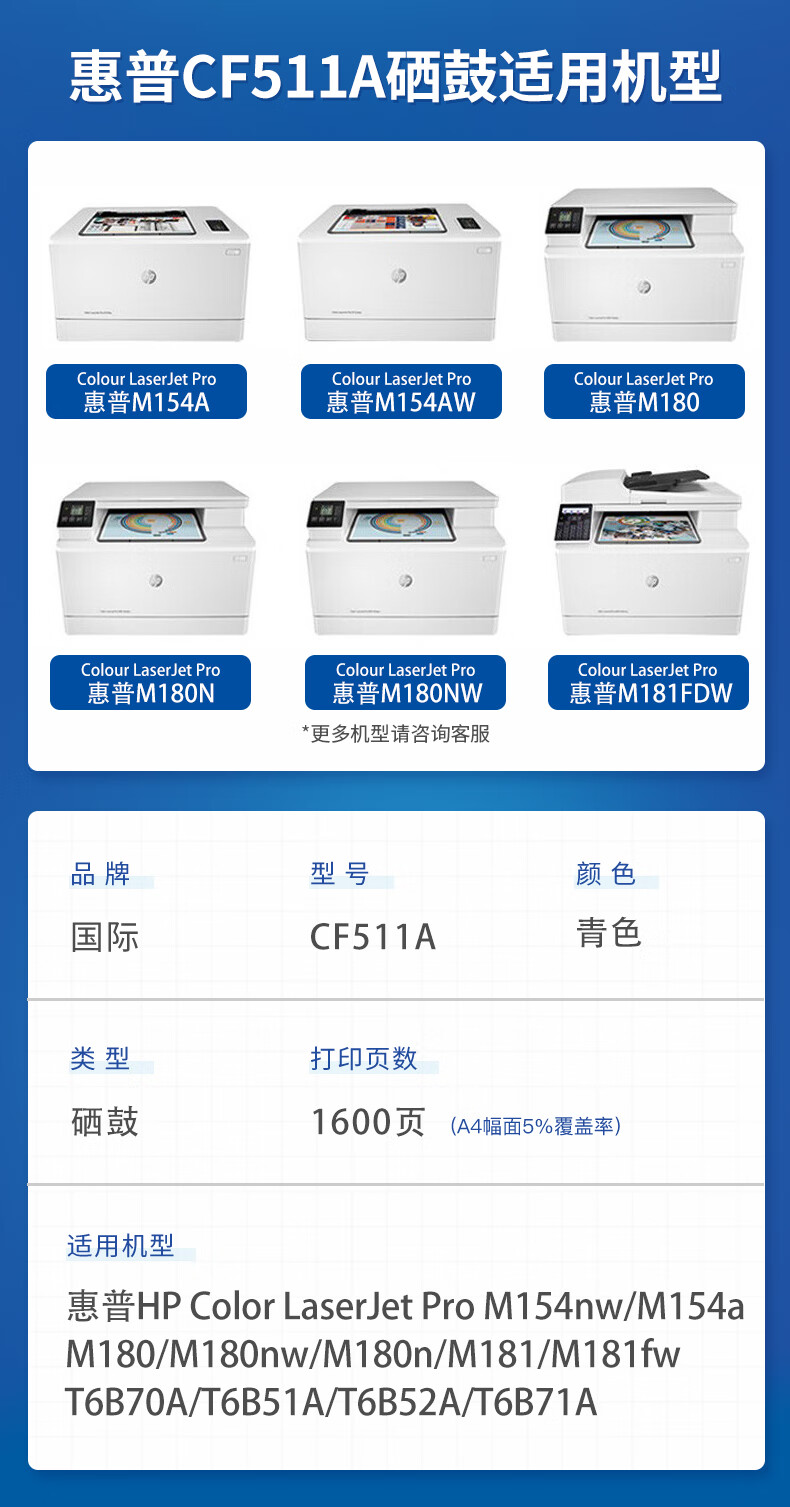 国际 CF511A 硒鼓 适用惠普204a硒鼓m154a硒鼓m180n m181fw打印机墨盒m154nw【易加粉带芯片】CF511A 蓝色硒鼓