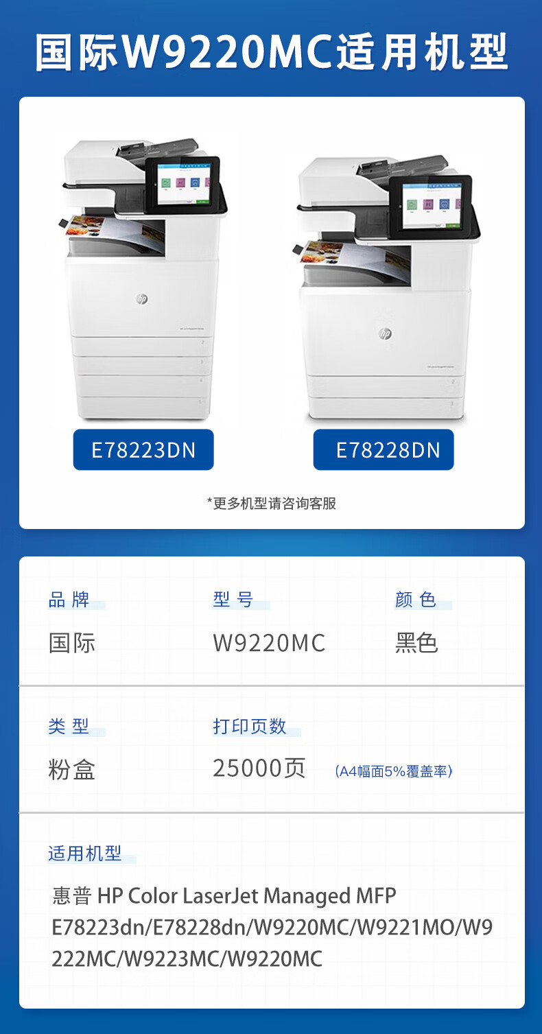 国际 W9220MC 粉盒 碳粉盒适用惠普E78223DN墨粉盒E78228DN粉盒彩色复印机墨盒 W9220MC 黑色粉盒 25000页