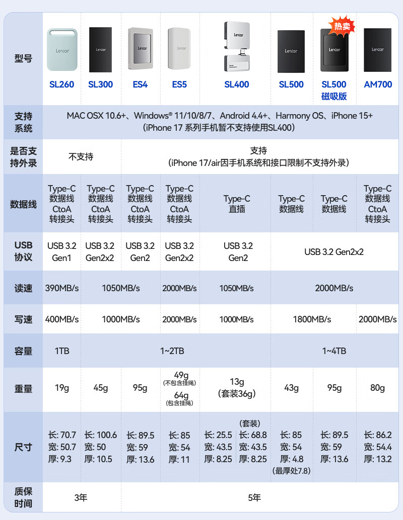 雷克沙/Lexar LAR700X 2T 移动硬盘 IP66防水防尘2000M