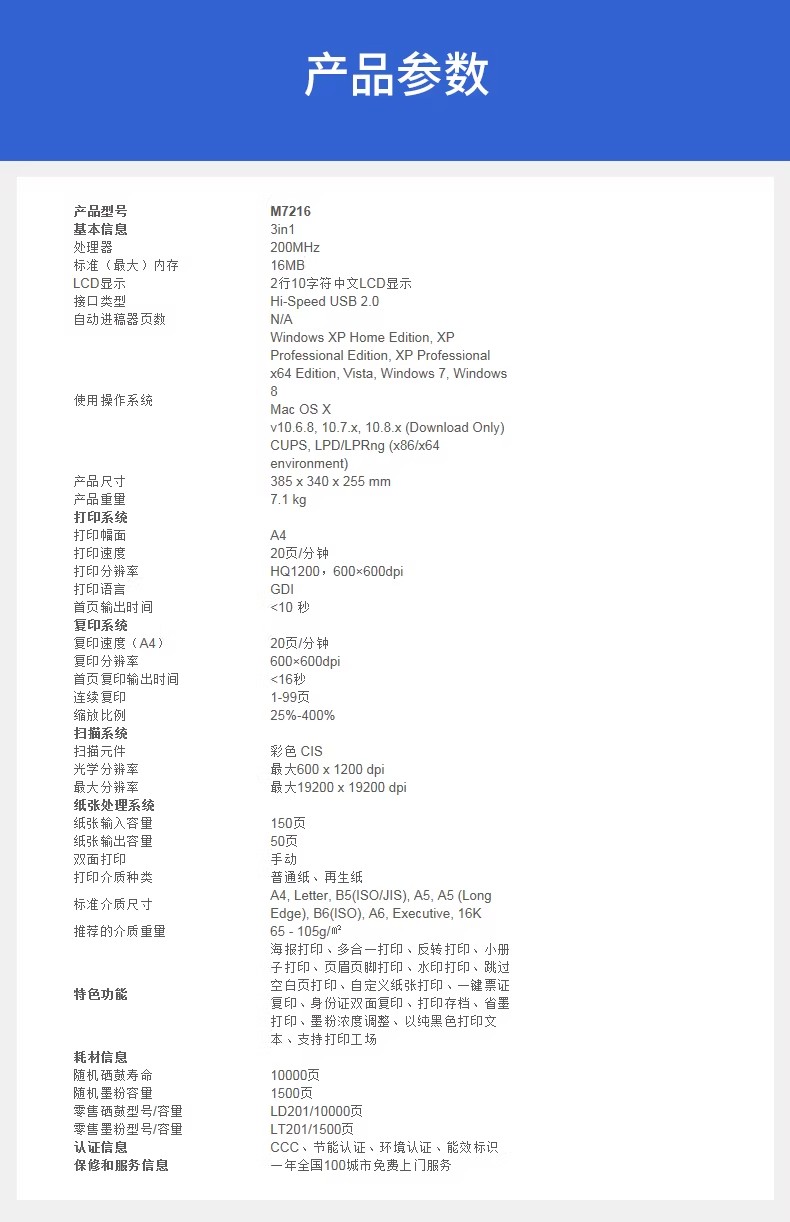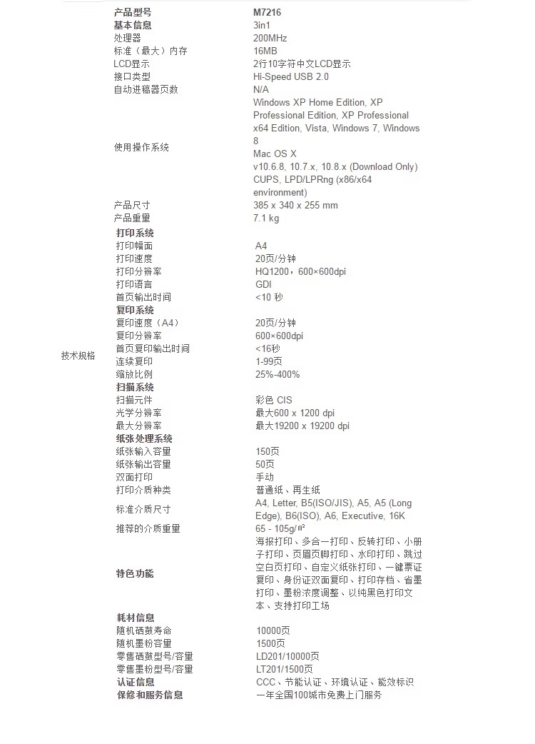 联想/LENOVO M7216 多功能一体机 无线黑白激光打印复印一体机