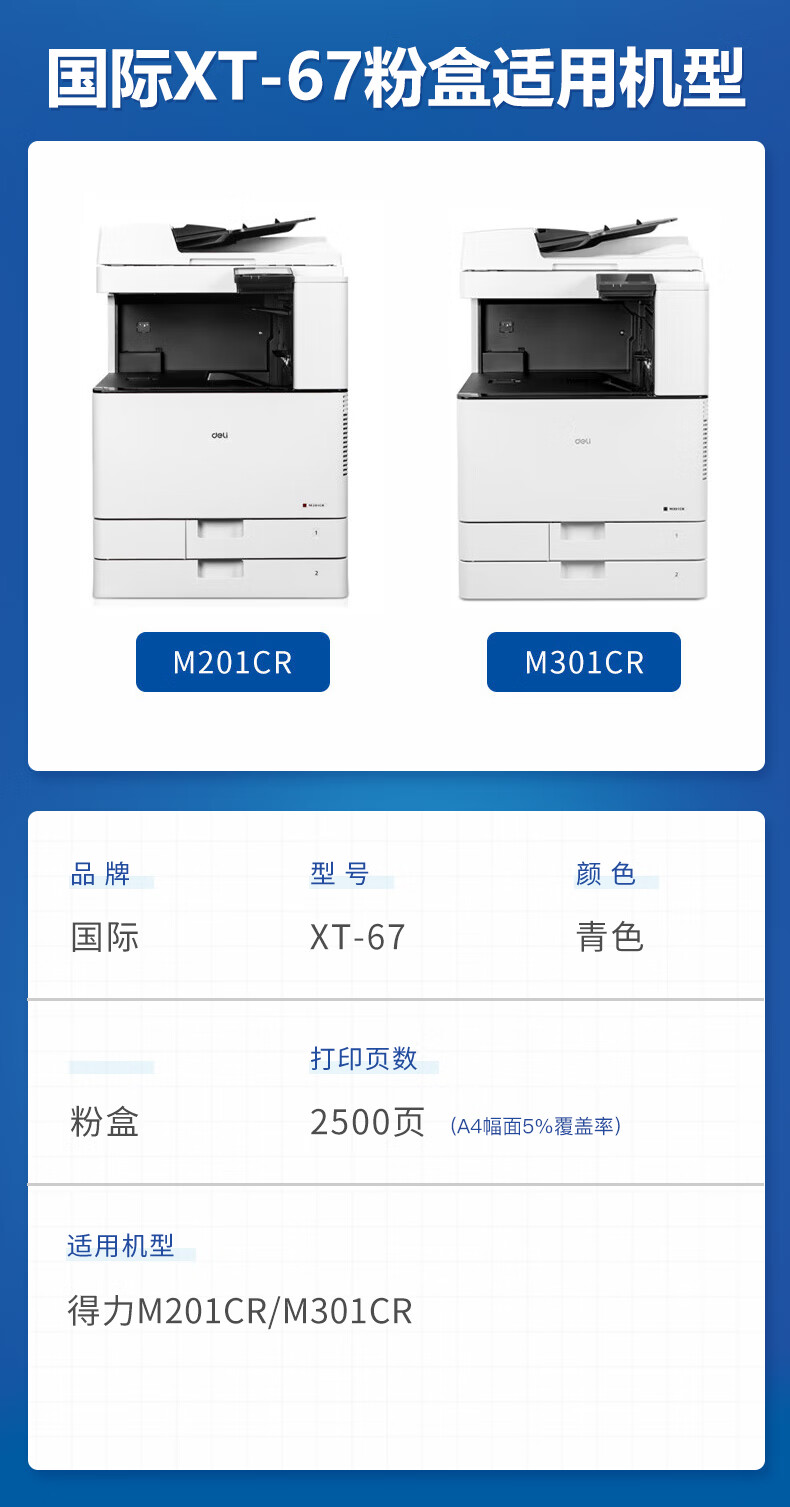国际 XT-67C 粉盒 适用得力复印机耗材M201CR硒鼓墨粉盒XT67Ke粉盒XT67碳粉感光鼓M301CR打印机晒鼓 XT67 标准青色粉盒