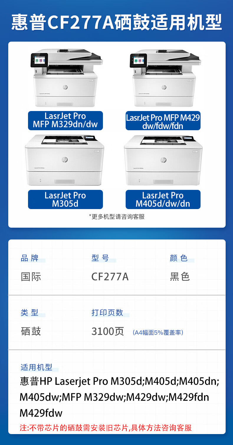 国际 CF277A 硒鼓 适用惠普M329dw硒鼓 M429fdw/fdn M405d打印机墨盒M305d【带芯片】77A黑色硒鼓3100页